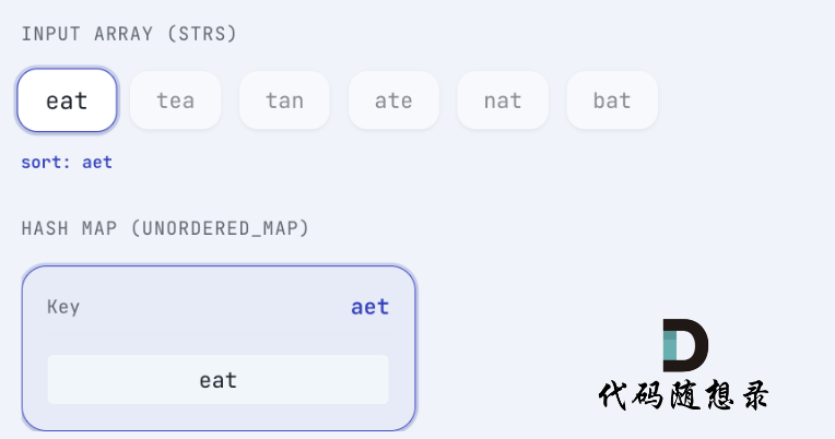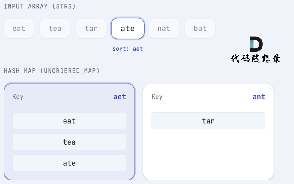 eat 排序后为 aet, 将 eat 放在 key为 aet 的map中: