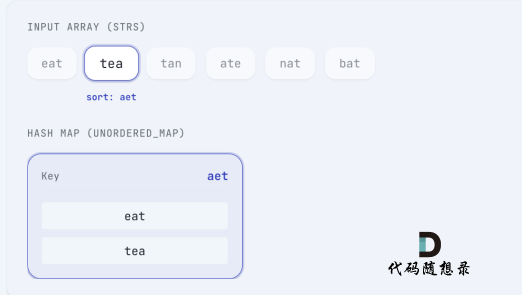 tea 排序后 为 aet,将 tea 放在 key 为 aet的map中: