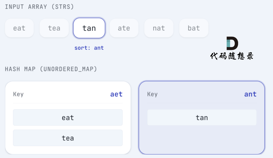 tan 排序后 为 ant,将 tan 放在 key 为 ant 的map中: