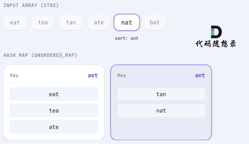 nat 排序后 为 ant ,将 nat 放在 key为 ant 的 map中: