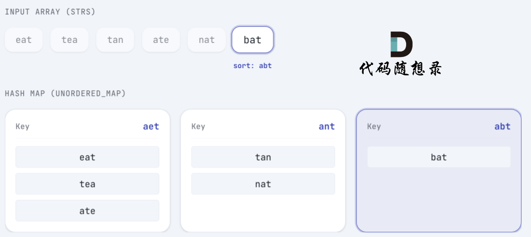 bat 排序后 为 abt,将 bat 放在 key为 abt 的map 中: