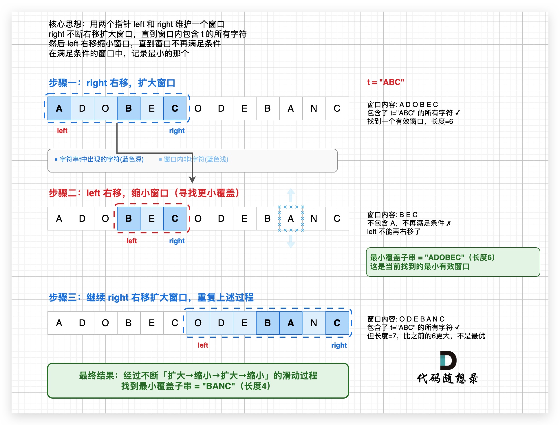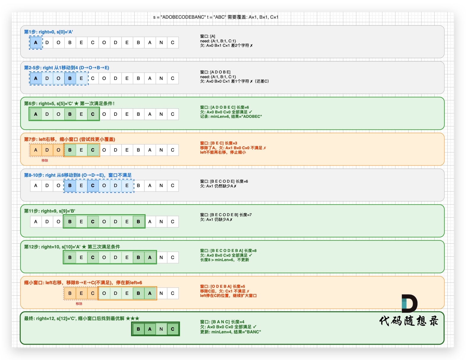 - right 继续右移到 12,窗口包含 ABC,left 右移缩小后得到 [BANC],长度 4