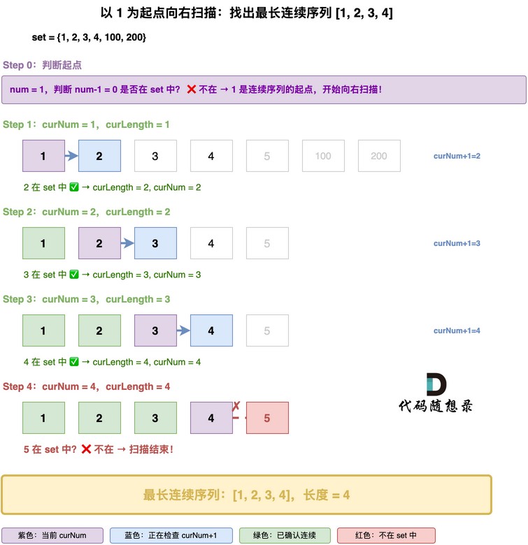 判断 (1+4) 就是 5 是否在集合里,5不在集合,停止继续判断,最终以 1 为起点的连续序列长度为4。