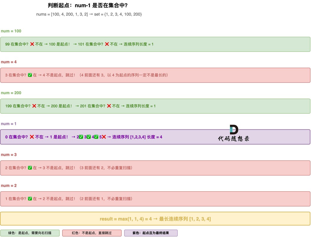 所以 if (uset.find(num - 1) == uset.end()) 是 本题代码的精髓所在。核心在于只有"连续序列的起点" 才需要向右扫描