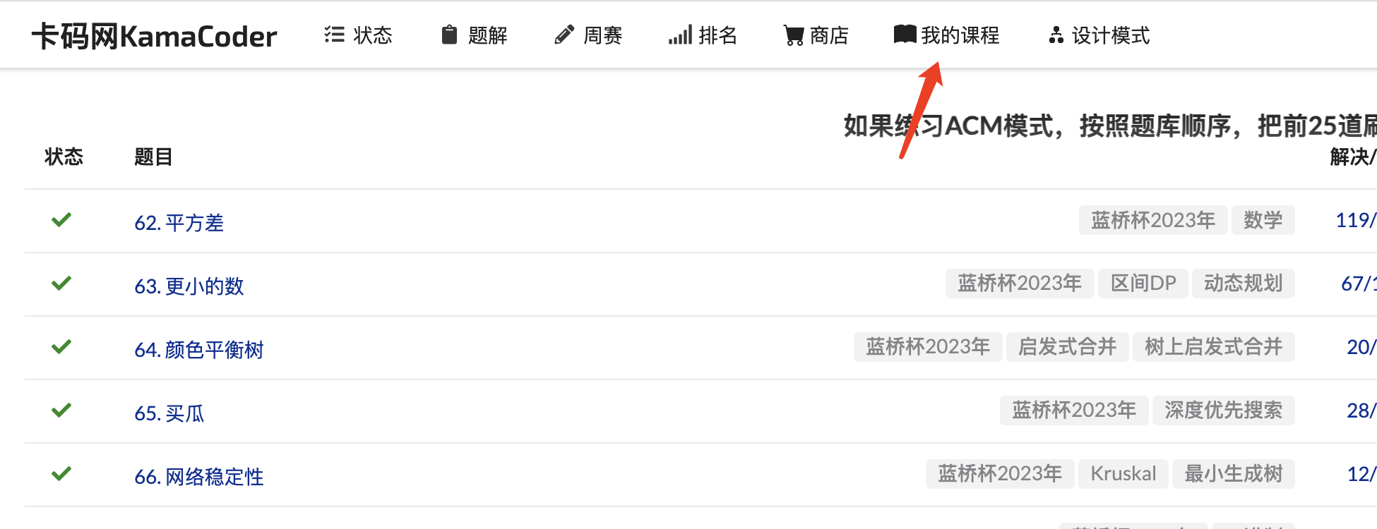 支付后,该课程在卡码网就会自动开动,登录卡码网(kamacoder.com) ,查看【我的课程】